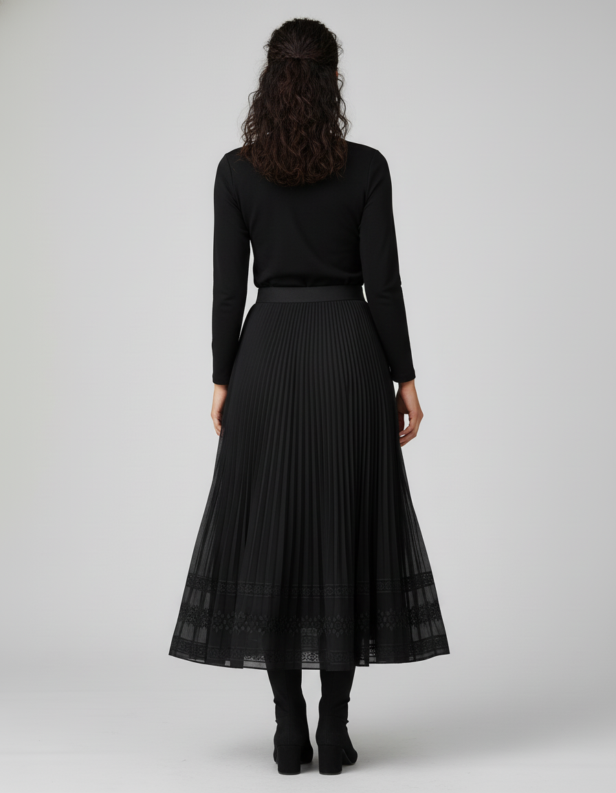 Cette jupe présente une coupe midi plissée et une couleur noire unie. Le bas de la jupe est orné d'un empiècement transparent avec un motif détaillé.