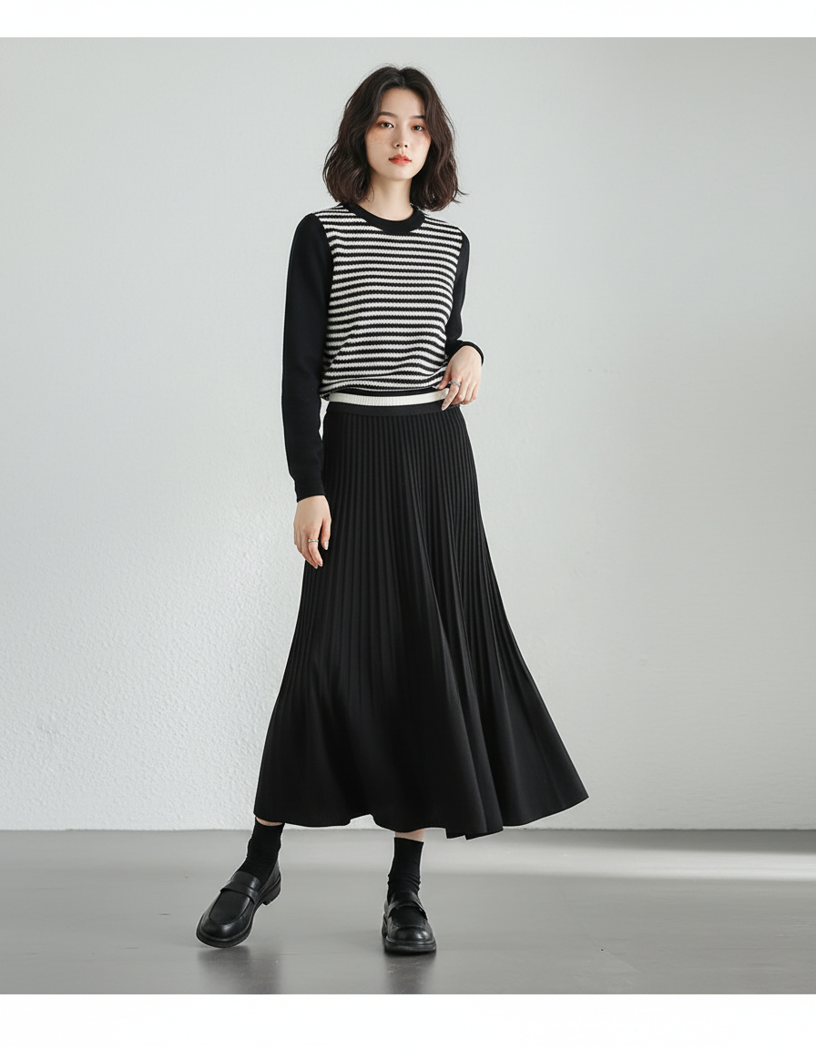 La jupe Midi Noire Plissée Élégante intemporelle est la pièce maîtresse qui transformera votre garde-robe. Pour le bureau, associez-la à une blouse en soie et un blazer ajusté pour une allure professionnelle et chic. En week-end, osez le pull en maille fine (comme notre modèle à rayures) et des mocassins ou bottines pour un look décontracté mais toujours sophistiqué. Pour une soirée spéciale, une camisole délicate et des talons feront de cette jupe la pièce maîtresse d'une tenue irrésistible. Sa polyvalence est sa force, vous permettant de créer une multitude de styles avec une seule pièce intemporelle.