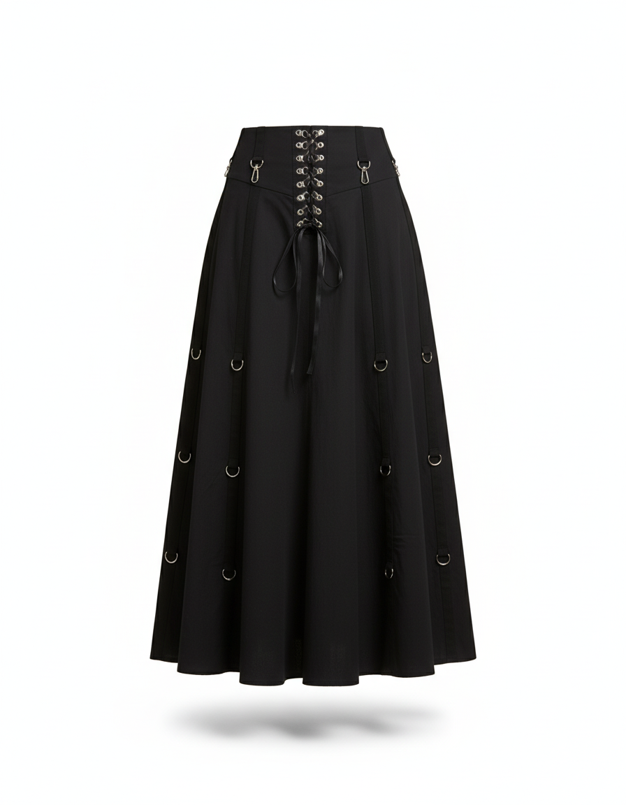 Cette jupe midi est de couleur noire et présente une taille de style corset avec un laçage central. Des anneaux métalliques sont également disposés le long de la jupe.