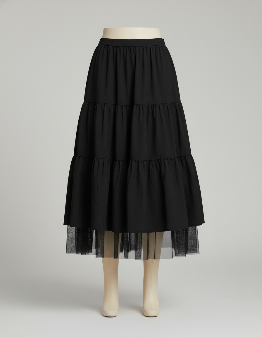 Cette jupe midi est de couleur noire et présente une conception à plusieurs niveaux. Elle intègre un ourlet en tulle visible, contribuant à sa silhouette fluide.