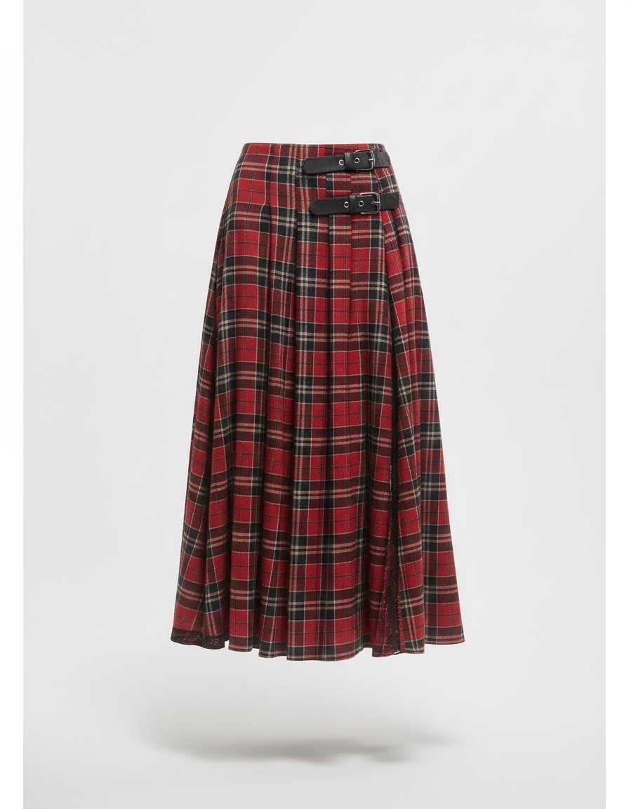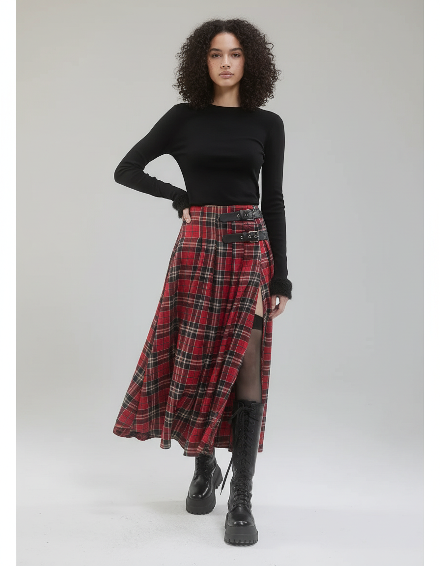 Découvrez la Jupe Midi Ouverte, une pièce maîtresse qui redéfinit l'élégance rock avec une audace assumée. Conçue pour celles qui osent affirmer leur style, cette jupe portefeuille en laine imprimée bouscule les codes traditionnels. Son motif écossais intemporel est sublimé par une fente haute résolument moderne et des boucles en cuir distinctives, offrant une silhouette dynamique et pleine de caractère. Ce n'est pas seulement une jupe, c'est une affirmation de votre singularité, une invitation à embrasser votre puissance avec assurance et un confort inégalé grâce à sa confection en laine de qualité supérieure.