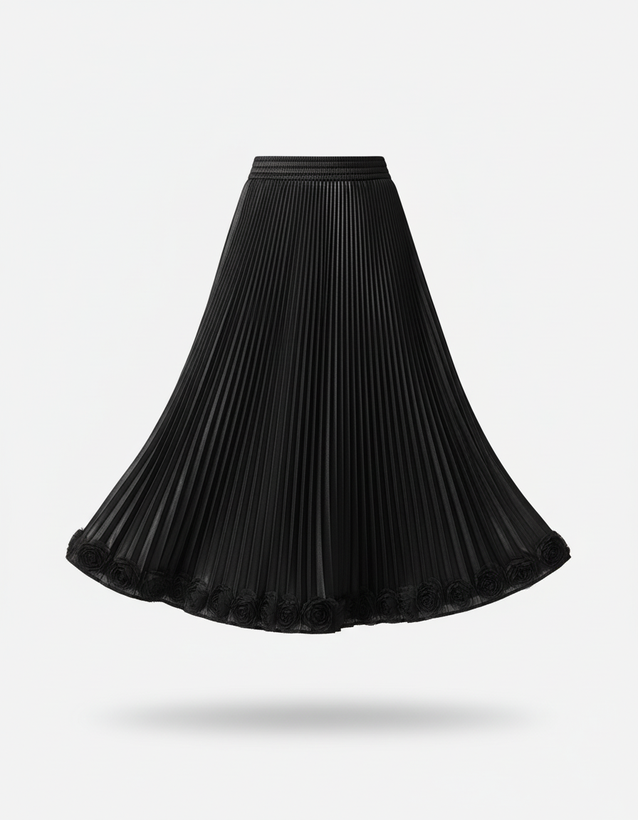Ce qui distingue notre Jupe Midi Plissée Cuir, c'est l'alliance parfaite entre la texture contemporaine du cuir plissé et la délicatesse inattendue de ses finitions. Chaque pli est une œuvre d'art, créant un mouvement fluide et une silhouette flatteuse. Mais c'est au niveau de l'ourlet que réside sa signature unique : une rangée de roses subtilement appliquées, ajoutant une dimension romantique et exclusive. Cette fusion audacieuse de force et de féminité transforme cette jupe en une déclaration de mode, un investissement dans un style intemporel et distinctif.