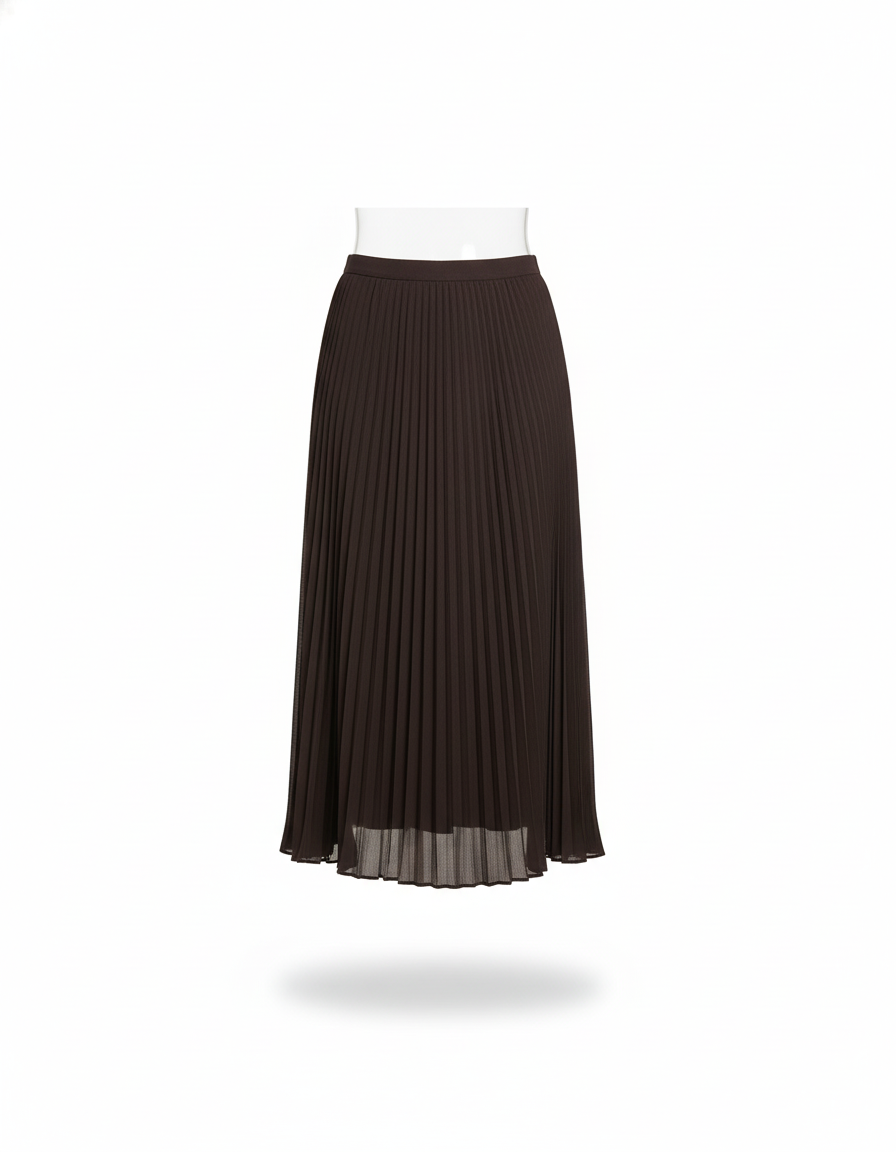 Cette Jupe Midi Plissée Marron Fluide peut être portée pour des contextes variés, allant des tenues quotidiennes aux occasions nécessitant une allure soignée.