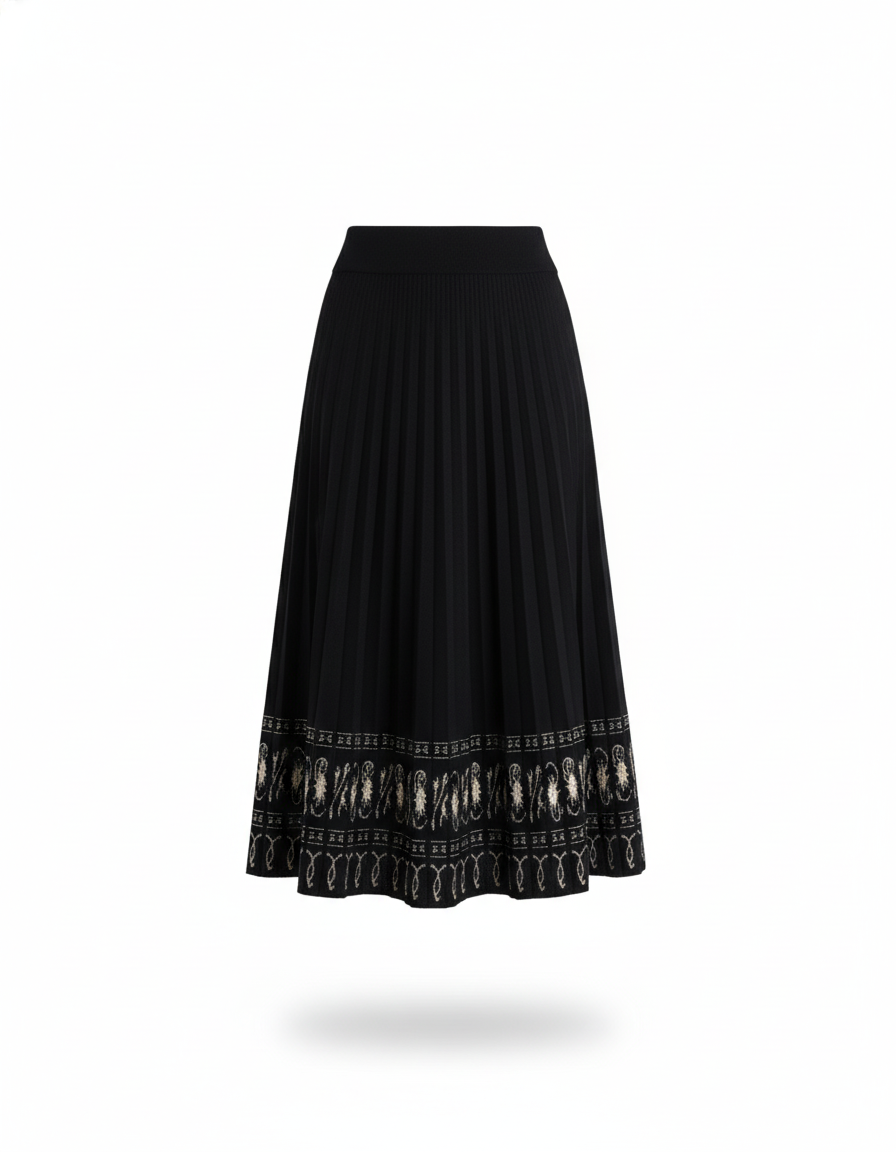 Cette jupe midi est de couleur noire et présente une coupe plissée. Un motif décoratif est visible le long de l'ourlet.