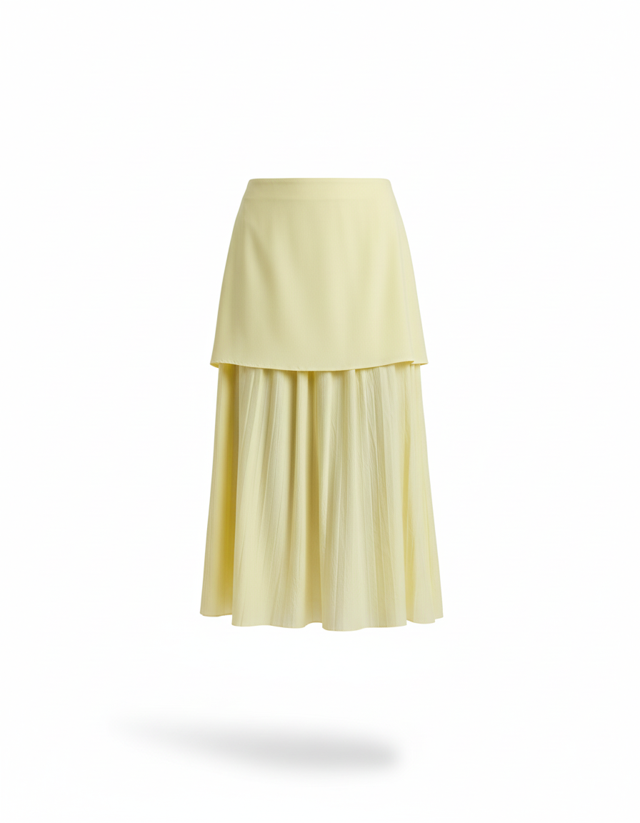 Cette jupe midi présente une couleur jaune pâle et une coupe superposée. Elle est composée d'une couche supérieure plus courte et d'une couche inférieure plus longue.