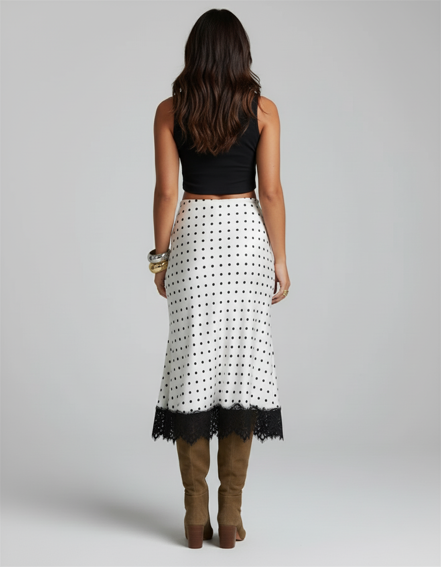 Ce qui distingue cette jupe midi est son mariage audacieux entre le charme rétro des pois et la sensualité contemporaine d'une délicate dentelle noire qui ourle le bas. Cette finition exquise ajoute une touche de sophistication inattendue, élevant la jupe au-delà du simple vêtement pour en faire une véritable œuvre d'art portable. Facile à associer avec un top minimaliste pour un look de jour chic ou avec des accessoires audacieux pour une soirée glamour, elle est la quintessence du luxe moderne et de la polyvalence.
