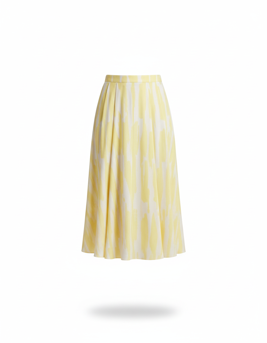 Cette jupe midi présente une silhouette fluide avec un motif à rayures abstrait jaune et blanc. Elle est dotée d'une taille haute et sa longueur atteint le mollet.