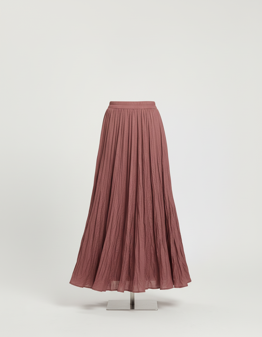 La jupe présente une coupe ample et fluide avec un effet froissé visible. Elle est de couleur rose et atteint une longueur midi, s'arrêtant généralement à la mi-mollet ou à la cheville.