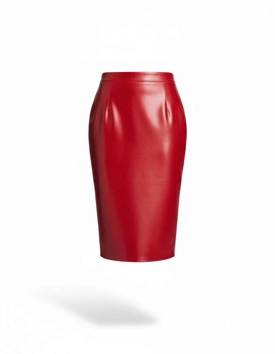 Cette jupe midi est un vêtement ajusté de couleur rouge, descendant sous le genou. Elle présente une surface brillante et une coupe taille haute.