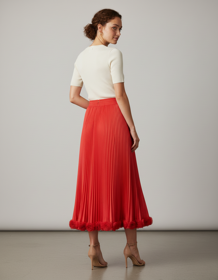Cette jupe midi est de couleur rouge et présente un design plissé. Des appliques florales sont présentes le long de l'ourlet.