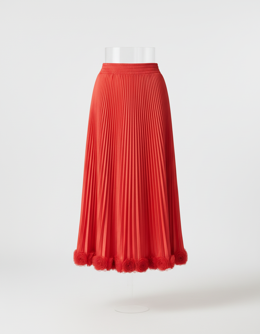 Confectionnée dans un polyester plissé d'une qualité exceptionnelle, sa silhouette fluide et aérienne épouse vos mouvements avec une légèreté exquise. Le rouge éclatant capture la lumière, tandis que sa véritable signature réside dans les délicates fleurs en relief qui ornent subtilement l'ourlet. Ce détail romantique et singulier élève la jupe au-delà du simple vêtement, en faisant une œuvre d'art portable. Que ce soit pour un événement spécial ou pour rehausser votre quotidien, la Jupe Midi Rouge Fleurie est la promesse d'un style unique et mémorable, qui vous distingue avec raffinement.