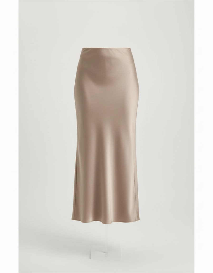 Adoptez l'élégance intemporelle avec notre jupe midi en satin beige, parfaite pour toutes les occasions.