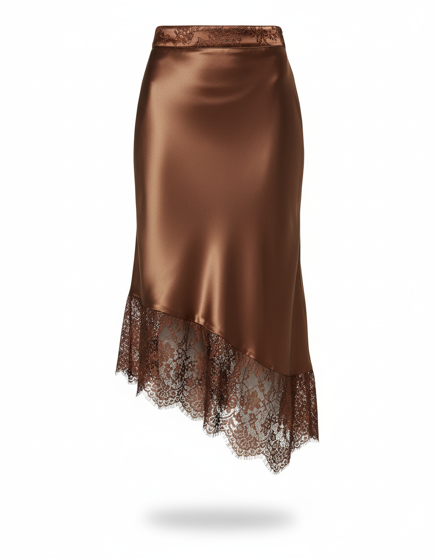 Ce qui la distingue ? Son satin marron d'une richesse profonde, qui épouse la silhouette avec une fluidité divine, et sa coupe asymétrique audacieuse, délicatement rehaussée d'une dentelle exquise. Cette fusion inattendue de textures et de formes crée un contraste saisissant, transformant une simple jupe en une œuvre d'art portable. Loin des standards, elle offre une sophistication moderne et une polyvalence qui transcende les saisons, faisant de chaque port une expérience unique.