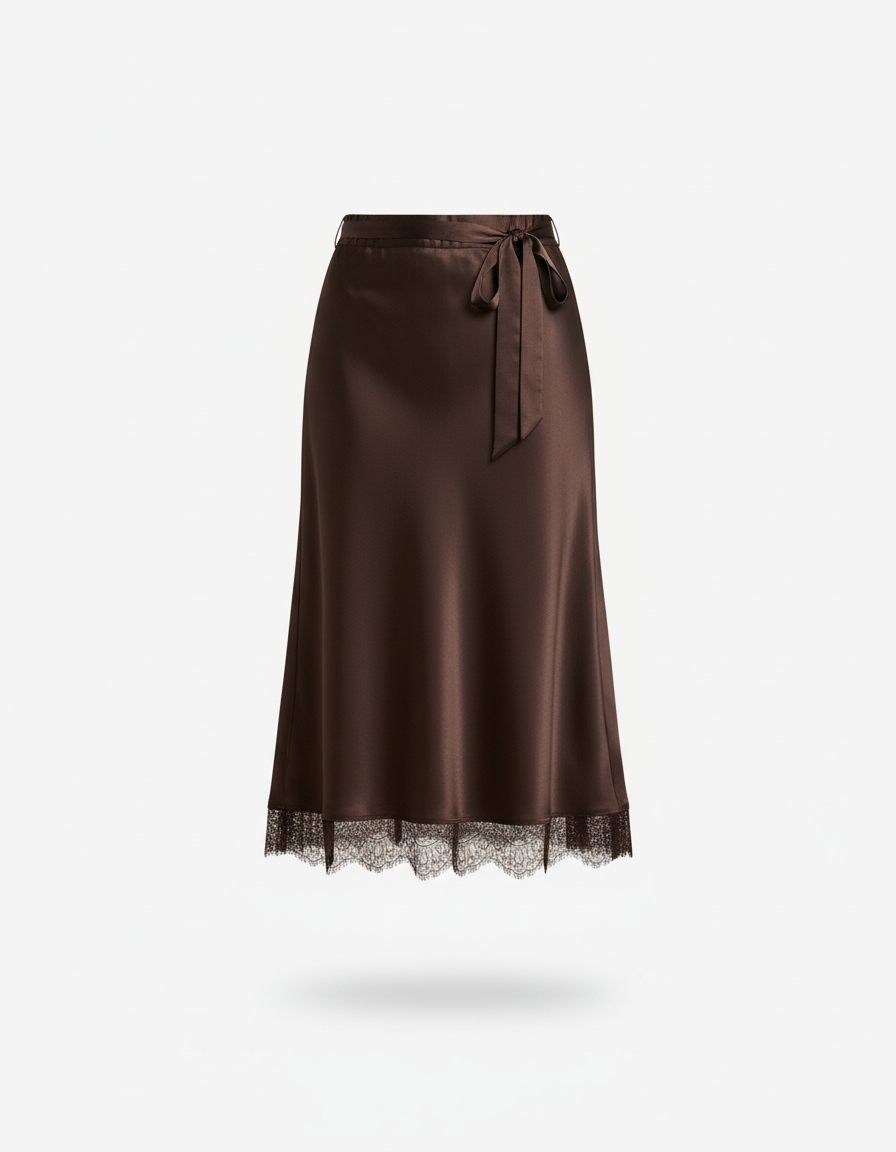 Jupe Midi Satin Marron Dentelle Élégante : Votre Allure Redéfinie