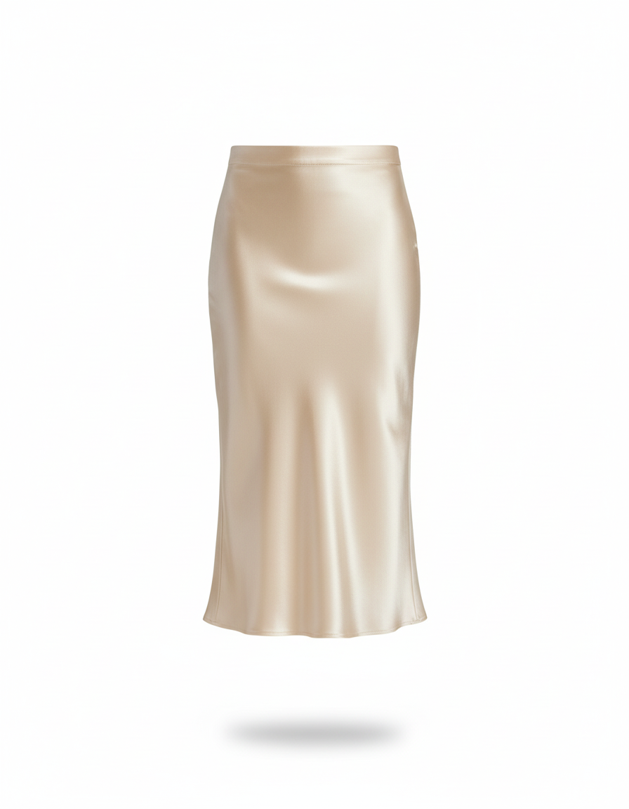 Adoptez une élégance intemporelle avec notre jupe midi satinée couleur champagne, parfaite pour toutes les occasions.