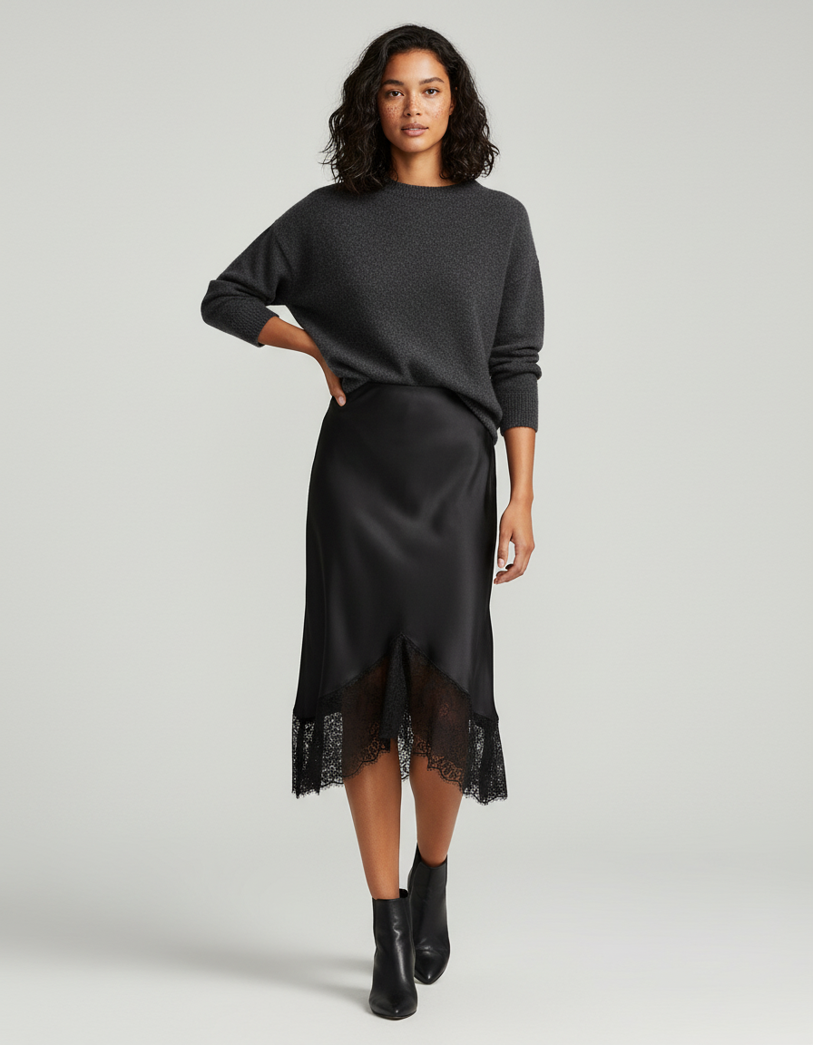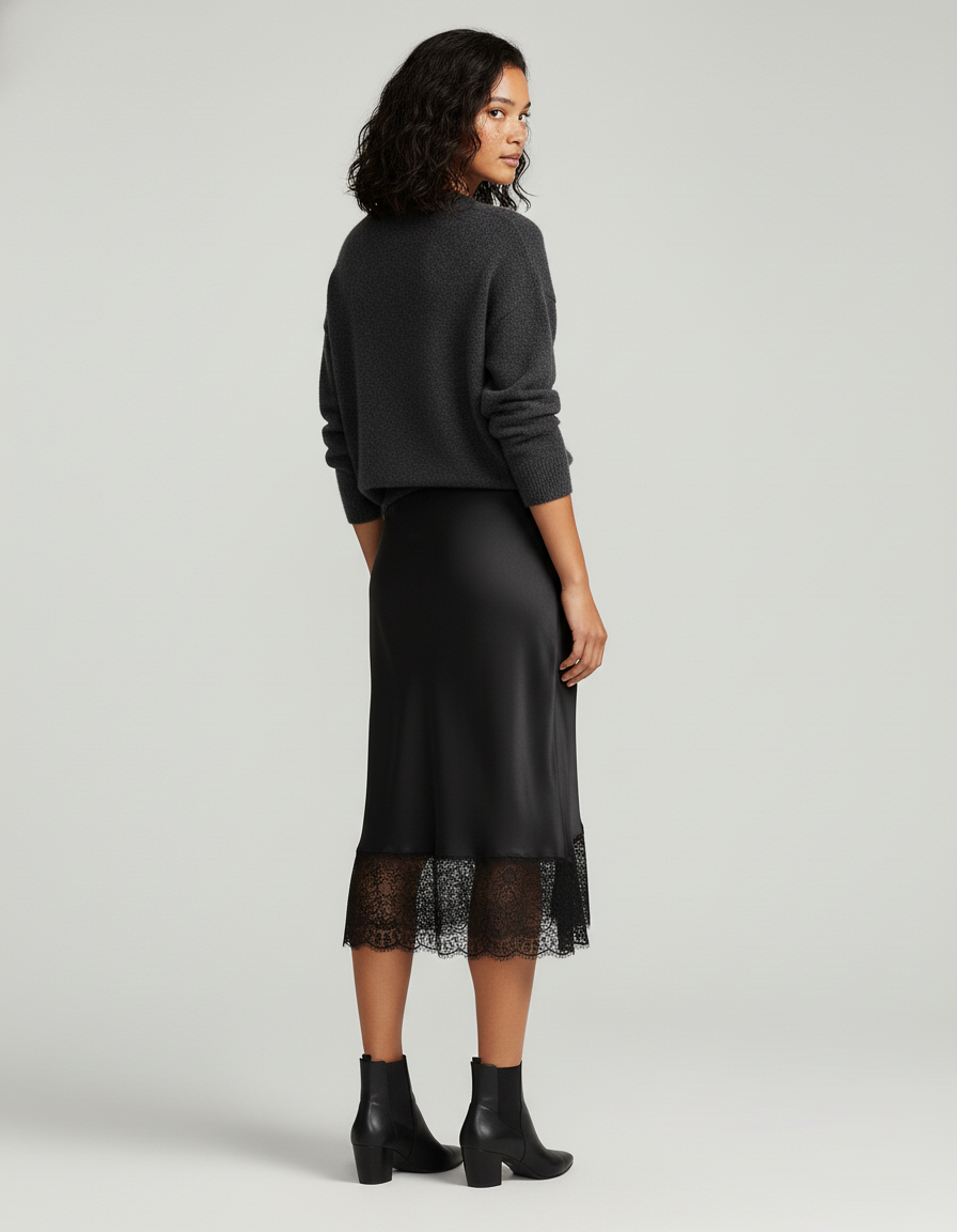 Ce qui la distingue, c'est l'alliance parfaite entre le satin somptueux et la dentelle délicate qui ourle discrètement le bas. Cette touche de raffinement, loin d'être ostentatoire, ajoute une dimension de préciosité et de féminité. Le tombé impeccable du satin met en valeur chaque mouvement, tandis que la dentelle révèle juste ce qu'il faut pour captiver. Facilement associable à un pull en maille ou un top en soie, elle s'adapte à votre vie. Une pièce maîtresse qui transcende les tendances.