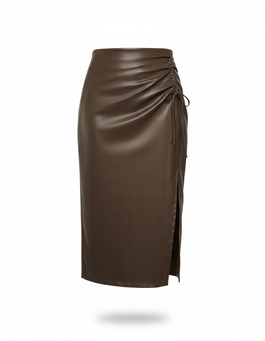 Cette jupe est confectionnée dans un matériau d'aspect cuir de couleur marron foncé. Elle présente une coupe droite, une fente haute sur le côté et des fronces ajustables.