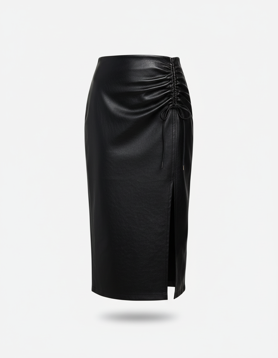 Ce qui la distingue ? Un simili cuir d'une qualité exceptionnelle, doux au toucher et visuellement indistinguable du cuir véritable, offrant à la fois durabilité et éthique. Sa fente latérale discrète apporte une touche de sensualité subtile et assure une liberté de mouvement incomparable. Les fronces délicates sur le côté ajoutent une dimension texturée unique, transformant cette jupe en une œuvre d'art portable. C'est la promesse d'un luxe accessible et d'un style qui ne fait aucun compromis entre l'audace et la sophistication.