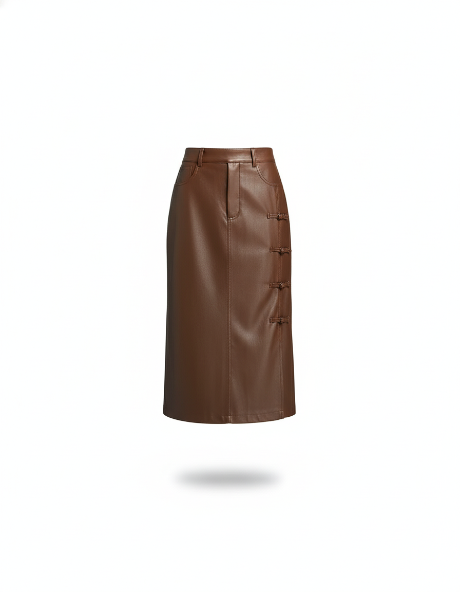 Cette jupe midi est confectionnée en similicuir marron foncé et présente une coupe droite. Elle est agrémentée de boucles décoratives sur le côté gauche.