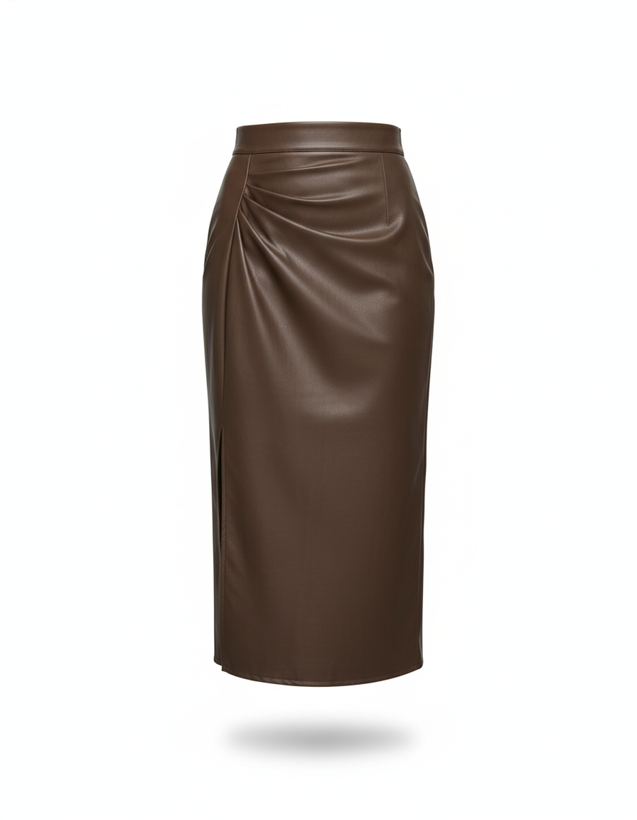 Ce qui distingue notre jupe, c'est son similicuir haut de gamme, choisi pour sa souplesse et son rendu luxueux, imitant à la perfection le cuir véritable. Les fronces délicatement placées subliment la silhouette, créant un drapé flatteur qui épouse vos courbes avec grâce. Sa teinte marron profonde, à la fois riche et polyvalente, s'associe aisément à votre garde-robe. Ajoutez à cela une fente discrète pour une liberté de mouvement et une touche de sensualité, et vous obtenez une pièce unique, synonyme de modernité et de raffinement.