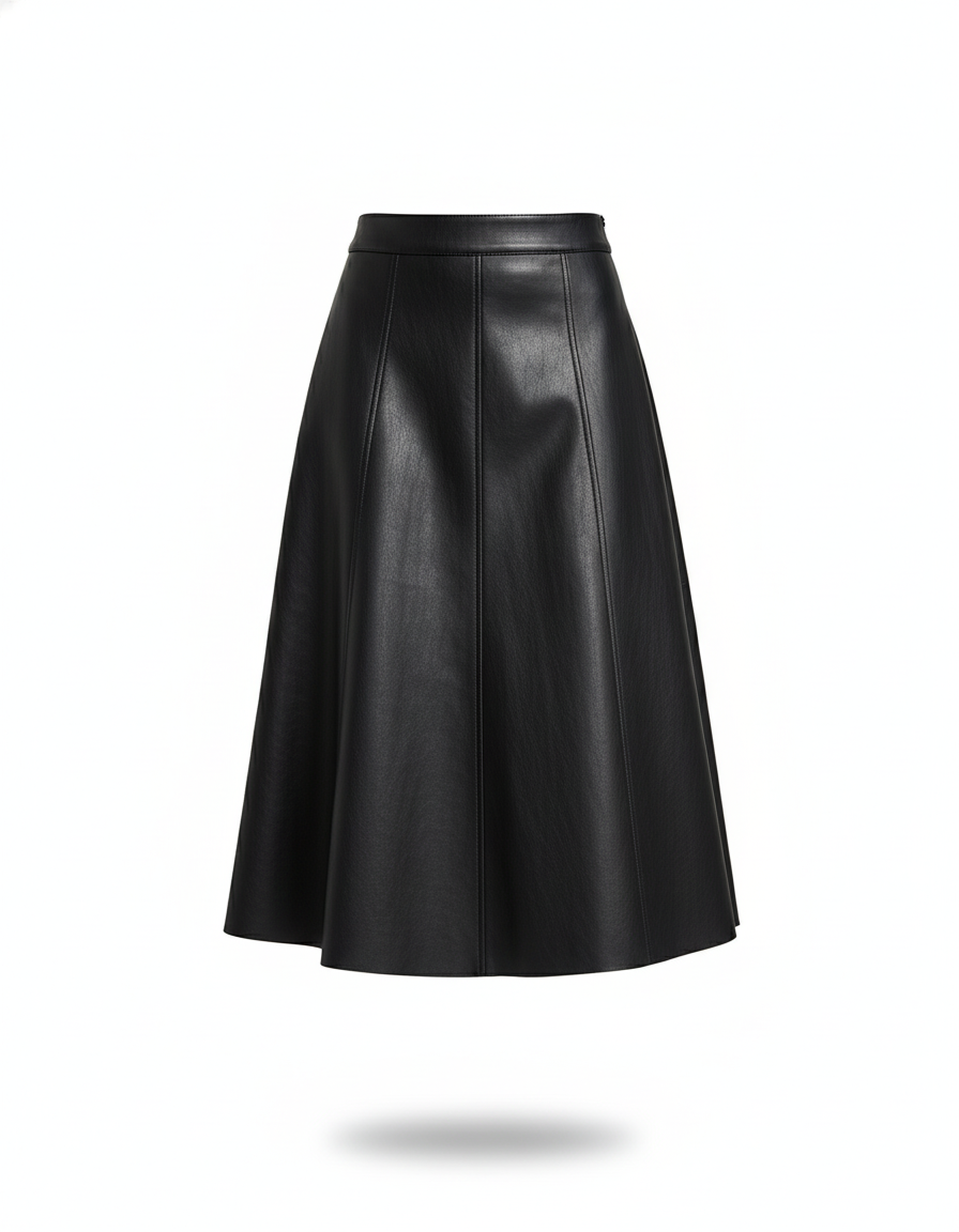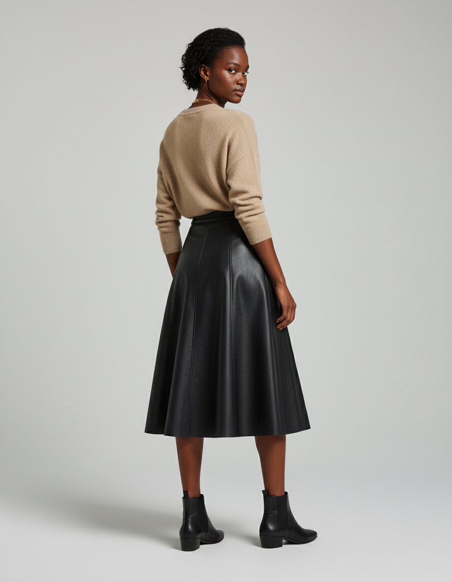 Jupe Midi Similicuir Noire, Coupe Évasée