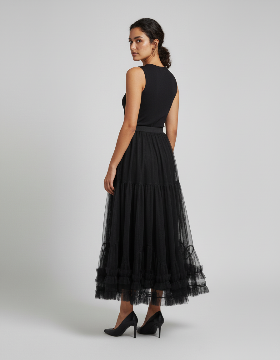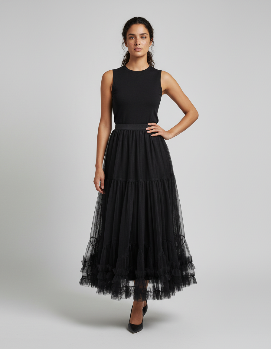 La Jupe Midi Soirée incarne la quintessence du chic romantique. Confectionnée en tulle noir aérien et ornée de volants délicats, elle offre une silhouette fluide et sophistiquée, parfaite pour sublimer votre allure. Idéale pour vos soirées les plus élégantes, associez-la à un top en soie ajusté et des talons aiguilles pour un glamour absolu. Pour une approche plus contemporaine et décontractée-chic, mariez-la à un pull en cachemire fin et des bottines, ou osez un blazer structuré pour une touche audacieuse en journée.
