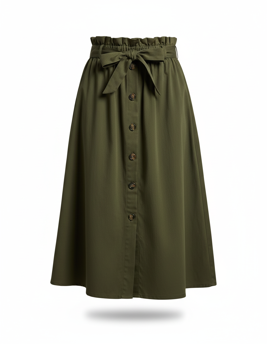 Jupe Midi Taille Haute Ceinturée à Boutons