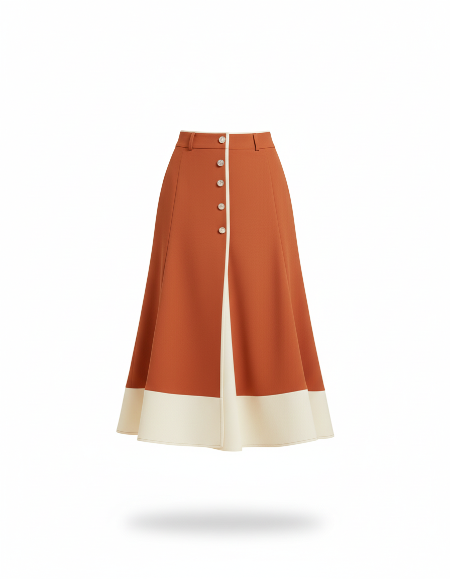 Ce qui distingue la Jupe Midi Terracotta, c'est son audace subtile : une teinte orange vibrante qui dialogue harmonieusement avec un empiècement crème contrastant, créant une dynamique visuelle unique. Les boutons décoratifs sur le devant ajoutent une touche de sophistication discrète, tandis que le polyester premium assure un tombé parfait et une tenue irréprochable. C'est la jupe idéale pour celles qui recherchent une pièce forte, chic et polyvalente, capable de transformer n'importe quelle tenue en une déclaration de mode distinguée.