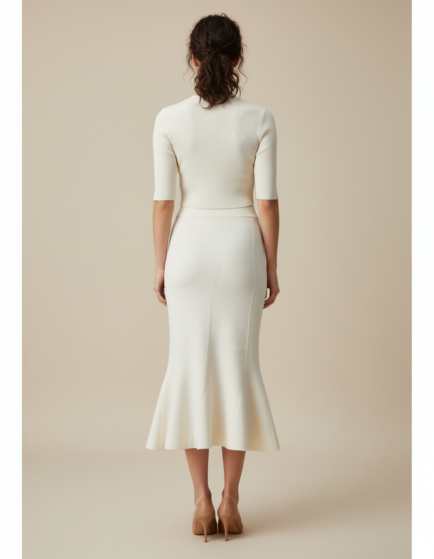 Découvrez notre jupe midi tricotée à la coupe sirène, parfaite pour une silhouette raffinée et moderne.