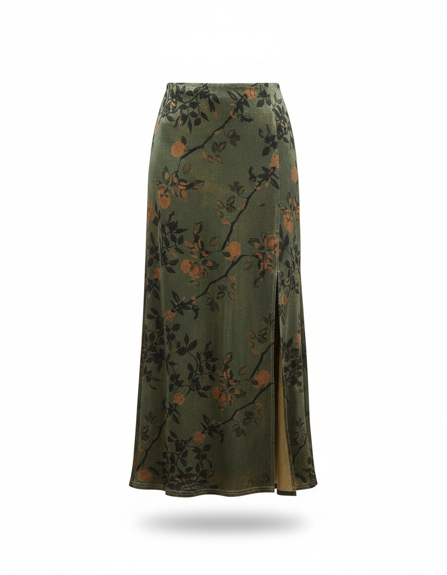 Jupe Midi Velours Fleuri Élégante avec Fente Latérale