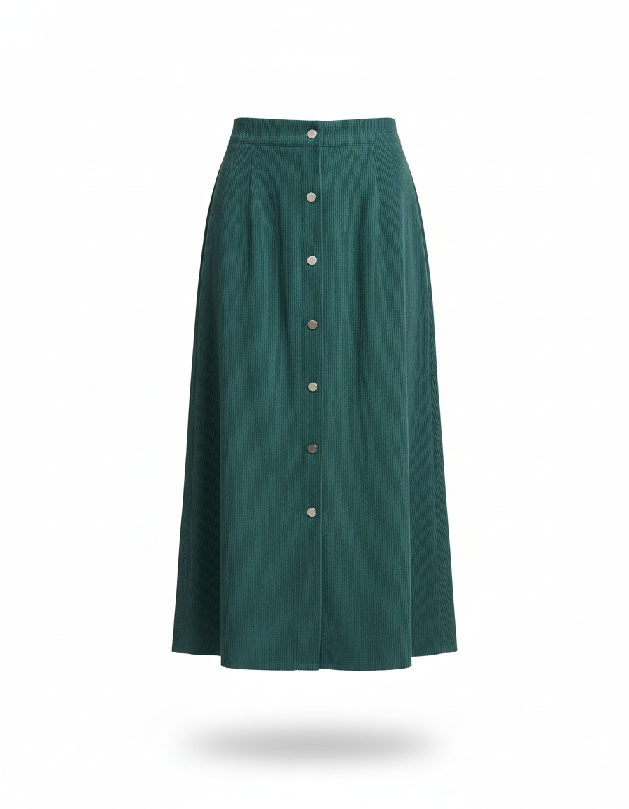 Jupe Midi Vert Côtelé Chic avec Patte de Boutons