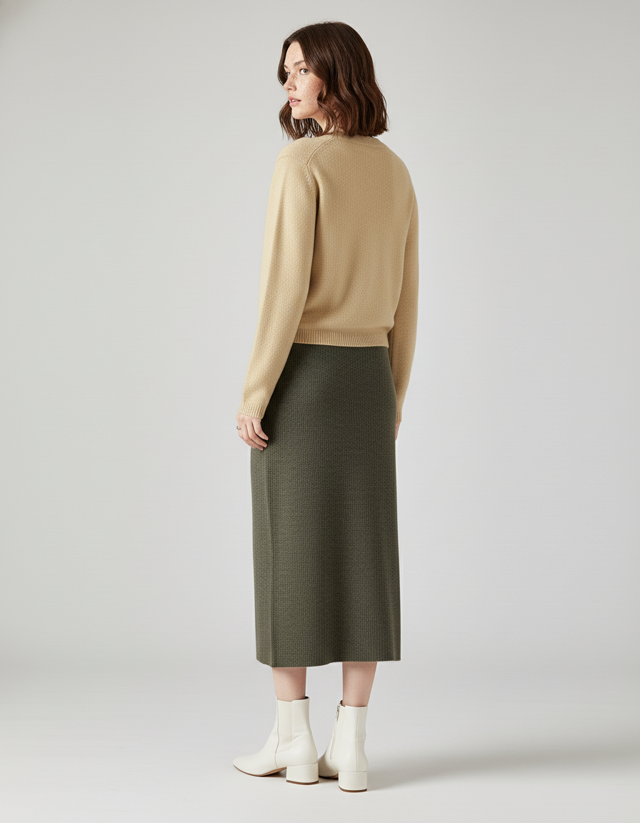 Cette jupe midi de couleur vert foncé présente une coupe droite et une texture côtelée. Elle est confectionnée en 100% laine mérinos extrafine d'Australie.