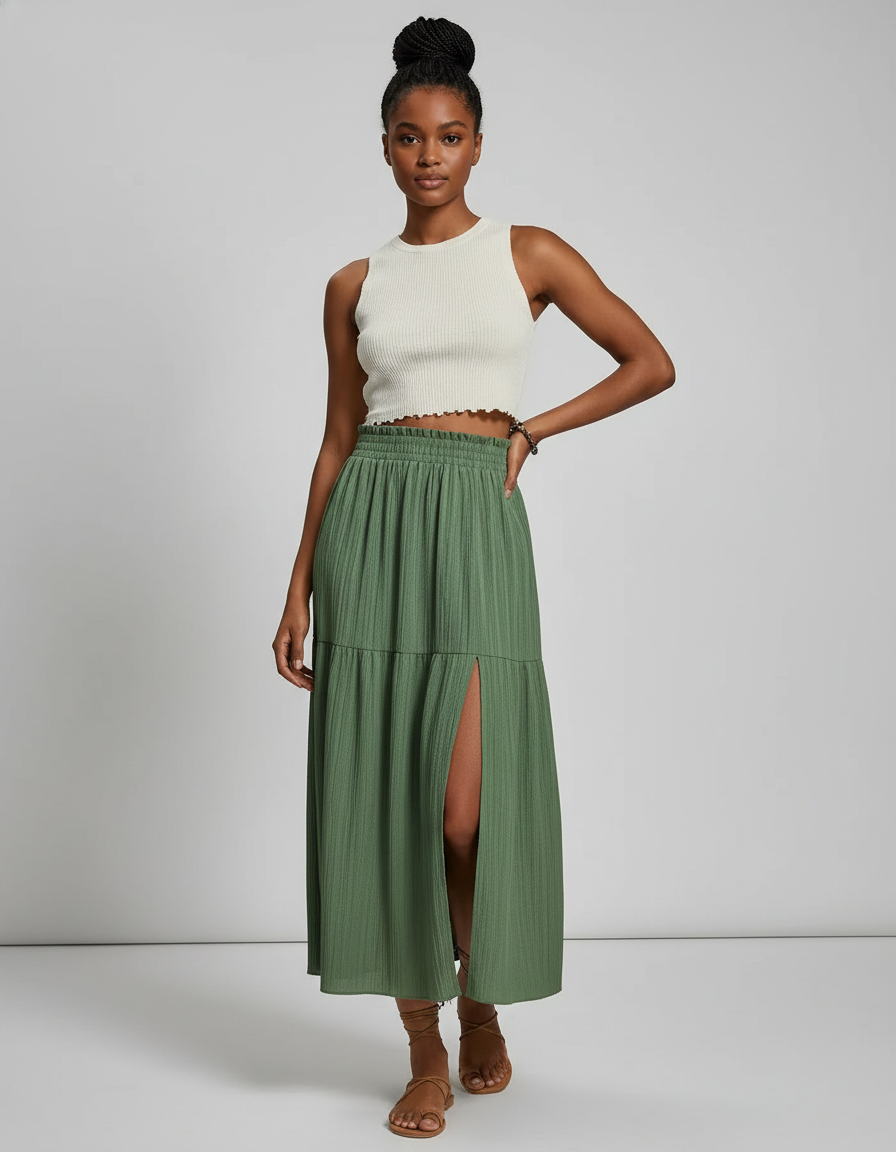 Adoptez un style décontracté et élégant avec notre jupe midi fendue, parfaite pour les journées ensoleillées.