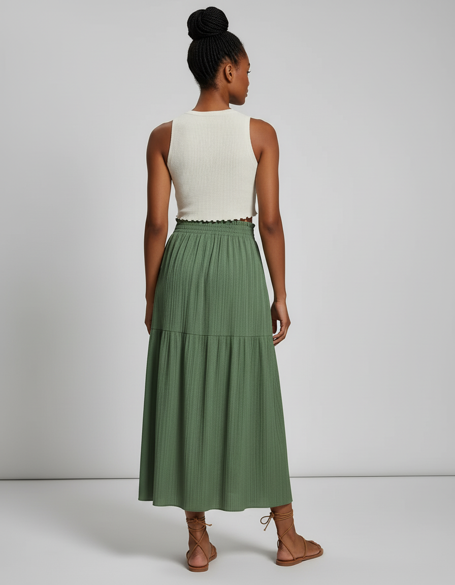 Cette jupe midi est adaptée pour des tenues de week-end, des sorties décontractées ou des journées ensoleillées, offrant une silhouette aérée.