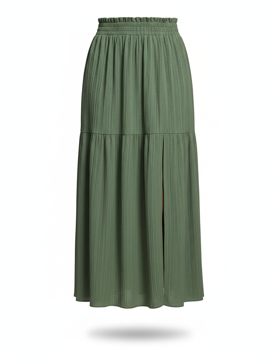 Découvrez l'élégance et le raffinement avec notre Jupe Midi Verte Fendue Plissée. Parfaite pour toutes les occasions, elle allie confort et style pour sublimer votre silhouette en toute simplicité.