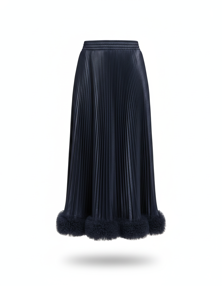 Façonnée dans un simili cuir de haute qualité, sa couleur marine profonde offre une alternative chic et contemporaine au noir classique, tandis que ses plis minutieux créent un mouvement fluide et gracieux. Ce qui la distingue véritablement, c'est sa finition unique : un ourlet délicatement orné de pompons en tulle assortis, ajoutant une touche de fantaisie et de luxe discret. Une jupe qui ne se contente pas de suivre les tendances, elle les définit, vous assurant de captiver les regards avec subtilité et caractère.