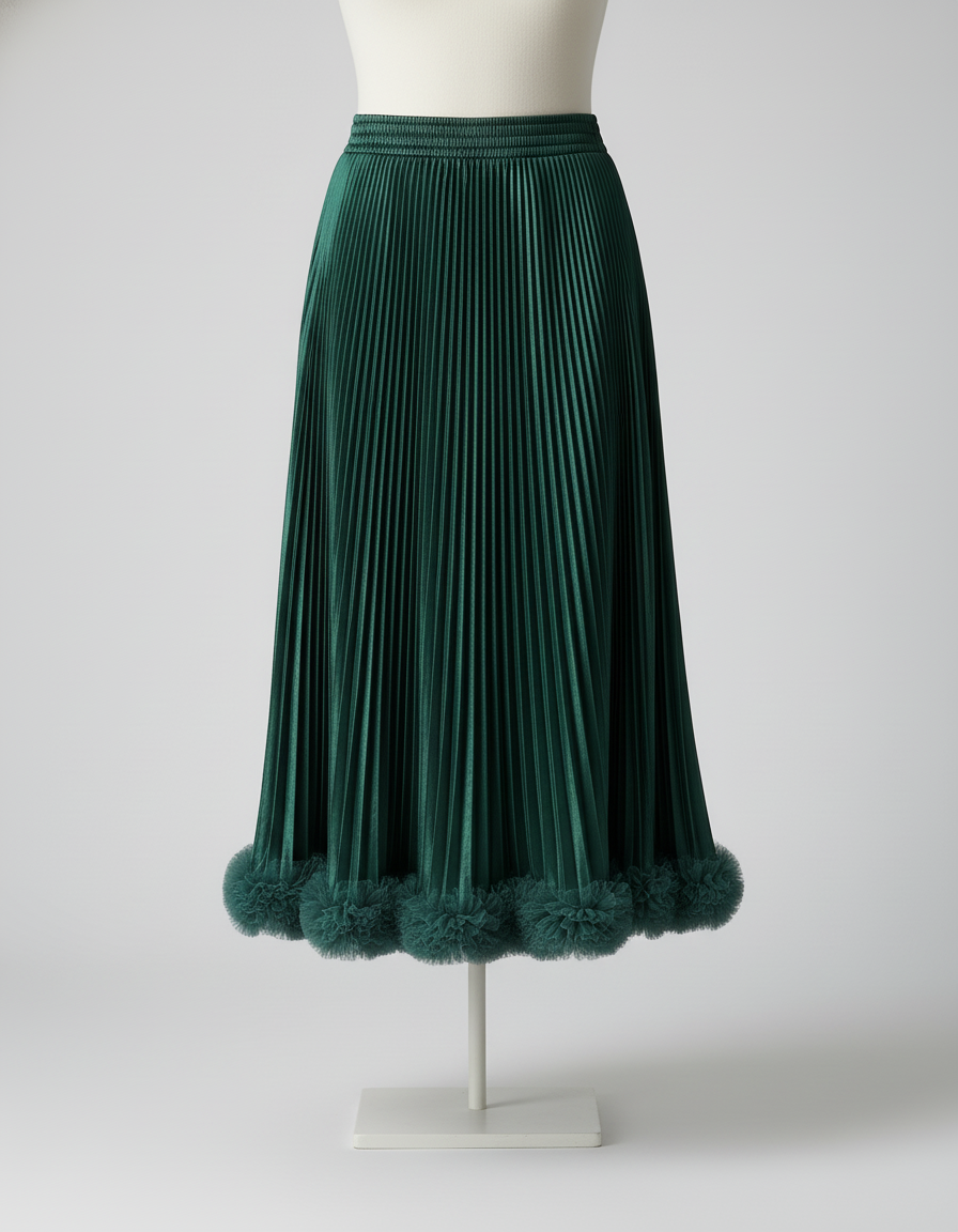 Façonnée dans un satin luxueux, d'un vert profond et vibrant, cette jupe est méticuleusement plissée pour créer une silhouette fluide et dynamique qui danse avec vous. Ce qui la distingue véritablement est sa bordure délicatement ornée de pompons de tulle ton sur ton, ajoutant une touche festive et un brin de fantaisie unique. Une fusion parfaite entre l'artisanat haut de gamme et un design audacieux, cette jupe ne manquera pas de marquer les esprits et de faire de chaque apparition un moment inoubliable.