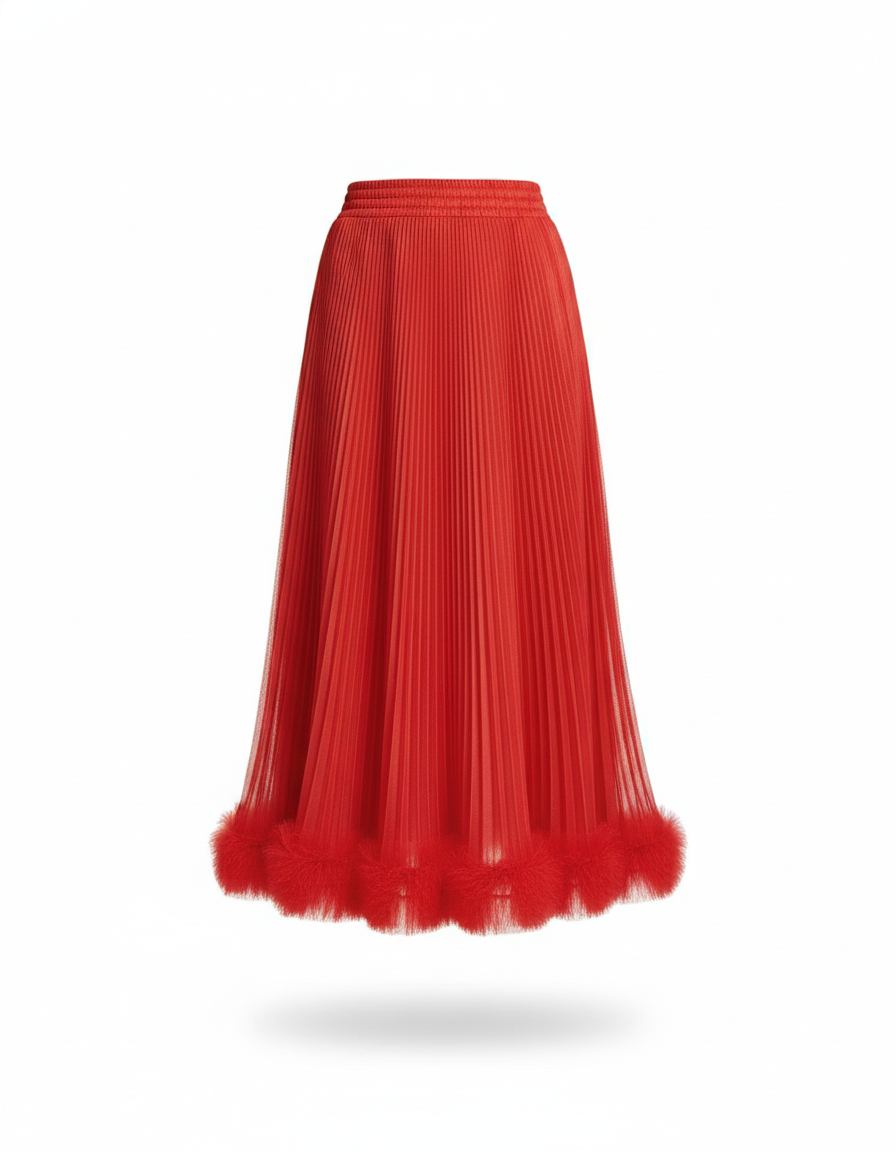 Ce qui distingue notre Jupe Rouge Midi, c'est son mariage parfait entre texture et mouvement. Son tulle plissé d'un rouge éclatant danse à chacun de vos pas, tandis que sa bordure en plumes délicates apporte une dimension de glamour inattendue et luxueuse. Loin des conventions, cette jupe est une déclaration de mode. Facile à associer avec un simple haut pour un look décontracté-chic ou avec une pièce plus élaborée pour une soirée spectaculaire, elle est la promesse d'une allure raffinée et singulière, qui célèbre votre individualité avec panache.