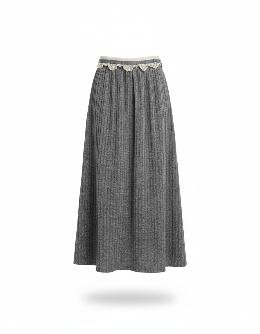 Cette jupe midi est de couleur grise et présente une texture côtelée. Sa coupe évasée s'étend sous le genou.